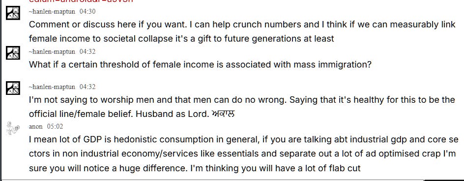 Edit 1 - a measure of female wealth vs tfr/societal collapse would be interesting.